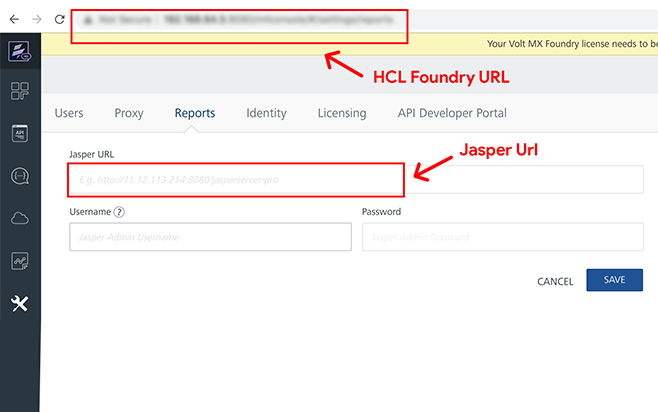 https://<voltmxfoundry-ip>:<port>Note: The JasperServer URL is required to be configured in MobileFarbic Console. For more details, refer to the image at the end of this section.