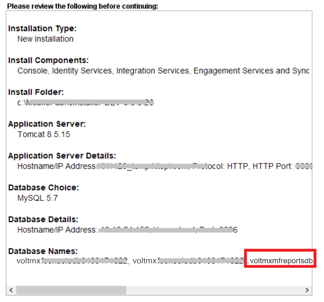 While installing Volt MX Foundry, the system creates the reports database, <prefix>mfreports<suffix>, based on the following choices only: