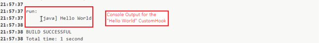 When you run this Custom Hook as part of any job, you will see [ java ] Hello World in the console output of the job.