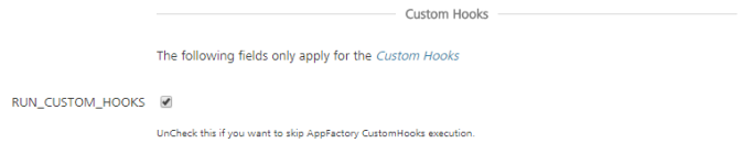 To run Custom Hooks as part of the buildFoundryApp job, enable the RUN_CUSTOM_HOOKS build parameter.