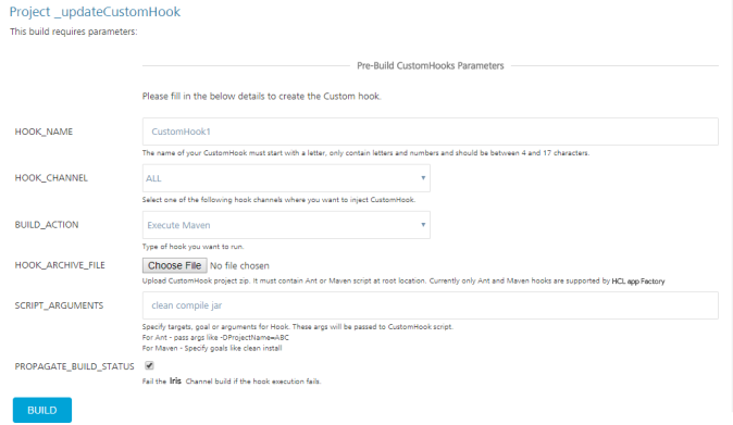 Parameter Description HOOK_NAME Specifies the name that is displayed in the respective hook point. HOOK_CHANNEL Specifies the channel on which you want to run your Custom Hook. For the Foundry build, the Hook Channel parameter can only be set to ALL. BUILD_ACTION Specifies the type of script you want to run for the Custom Hook.You can run an Ant script or a Maven script. The Build Action parameter is set to Execute Ant by default.
