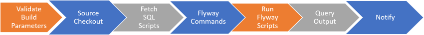 The Flyway job drives the execution of the Flyway scripts. The job consists of the following stages.