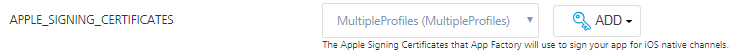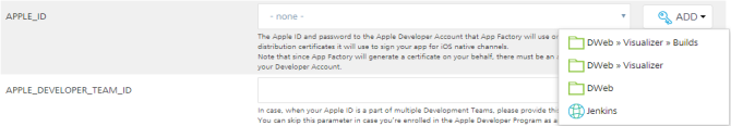 - While configuring parameters for the buildIrisApp job, next to the APPLE_SIGNING_CERTIFICATES parameter, click ADD. A drop-down list appears.