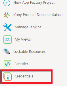- On the left pane of the App Factory Console, click Credentials . A list of credentials appears.