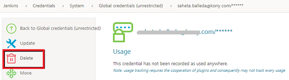 ]Parameter Description Scope Specifies the level at which the credentials are used. Contains the following options:System: The credentials are available to the associated object. Credentials with a System scope are used for email, authentication, slave connection, and scenarios in which the Jenkins instance uses the credentials.Global: The credentials are available to the associated object and also to the child objects. The credentials with a global scope are typically used for the additional requirements of a job.Note: For Cloud credentials, select Global. Username Specifies the Username of your Volt MX Cloud instance. Password Specifies the Password of your Volt MX Cloud instance. ID Specifies the unique identifier that jobs and other configurations use to identify the credentials.Note: HCL strongly recommends that you specify an ID that you can easily recognize.If this field is left blank, an ID is automatically generated, which you may not be able to recognize later. Description Specifies the details about the credentials. This is an optional field.HCL recommends that you provide a unique description so that you can easily distinguish the credentials while triggering a build. -
