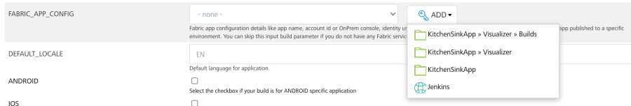 - While configuring the build parameters for the buildIrisApp job, next to ANDROID_KEYSTORE_FILE, click ADD. A drop-down list appears.