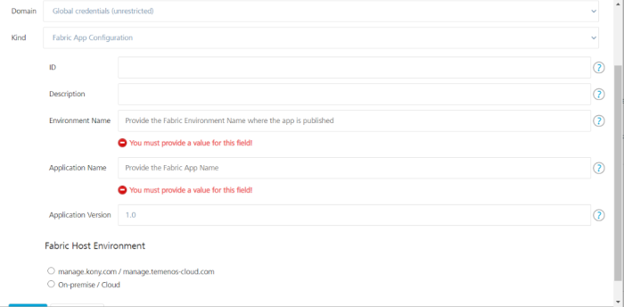 Parameter Description ID Specifies the unique identifier that jobs and other configurations use to identify the credentials.Note: HCL strongly recommends that you specify an ID that you can easily recognize.If this field is left blank, an ID is automatically generated, which you may not be able to recognize later. Description Specifies the details about the credentials. This is an optional field.HCL recommends that you provide a unique description so that you can easily distinguish the credentials while triggering a build. Environment Name Specifies the Volt MX Foundry name to which you want to publish the Foundry app. Application Name Specifies the name of the Foundry app that you want to bind to the project. Application Version Specifies the version of the Foundry app that you want to bind to the project. Foundry Host Environment Specifies the location of the Foundry server on which the cloud environment is hosted.Contains the following options:manage.hclvoltmx.com/manage.hcl.comThis check box specifies that the Foundry environment is hosted on the HCL AWS Cloud.When you select this check box, the Account ID parameter appears.On-Premise/CloudThis check box specifies that the Foundry environment is hosted on-premises or on other clouds (such as Azure).When you select this check box, the Console URL and Identity URL parameters appear. Account ID Specifies the account ID of the cloud on which the Foundry environment is hosted.The default account ID for this field is for the cloud that is linked to your App Factory environment. If you want link the project to a different cloud, type the account ID in the text box.This parameter is applicable only if manage.hclvoltmx.com/manage.hcl.com is selected as the Foundry Host Environment. Console URL Specifies the IP address (or the DNS) and port of the Foundry Console server. For example: http://1.2.10.20:8080This parameter is applicable only if On-Premise/Cloud is selected as the Foundry Host Environment.Note: The Foundry Console server must be accessible from the App Factory build environment.If the Foundry Console is behind a firewall, make sure that the IP address is white-listed.If the Foundry Console is on a local on-premise setup, make sure that you enable public IP.Identity URL Specifies the IP address (or the DNS) and port of the Foundry identity server. For example: http://1.3.10.30:8080This parameter is applicable only if On-Premise/Cloud is selected as the Foundry Host Environment.Note: The Foundry identity server must be accessible within the App Factory build environment.If the Foundry identity server is behind a firewall, make sure that the IP address is white-listed.If the Foundry identity server is on a local on-premise setup, make sure that you enable public IP. -