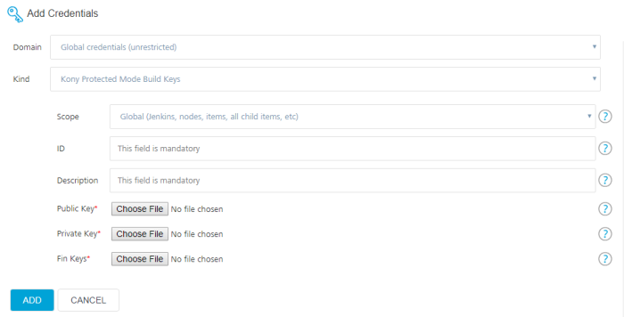 Parameter Description Scope Specifies the level at which the credentials are used. Contains the following options:System: The credentials are available to the associated object. Credentials with a System scope are used for email, authentication, slave connection, and scenarios in which the Jenkins instance uses the credentials.Global: The credentials are available to the associated object and also to the child objects. The credentials with a global scope are typically used for the additional requirements of a job. Public Key Specifies the public key that is used for encryption and to protect the app. Private Key Specifies the private key that is used for encryption and to protect the app. Fin Keys Specifies the fin keys that you want to use for the app.Fin Keys must be uploaded in a zip archive. The key files must be at the root of the zip archive, which must not have any sub-folder within the zip.