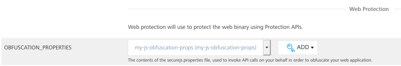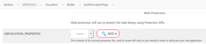 - From the Web Protection section in the buildIrisApp job, next to the OBFUSCATION_PROPERTIES parameter, click ADD. A drop-down list appears.