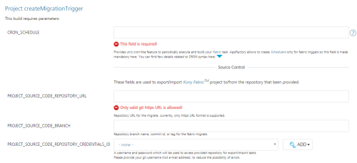 CRON_SCHEDULE - Specify the UNIX cron-like feature to periodically execute and build your Foundry task. The field is mandatory as App Factory allows you to create Schedulers only for Foundry triggers.