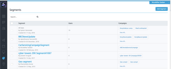 Segments are subset of the users in the Engagement server who satisfy a certain criteria. Segments are used to send targeted messages using campaigns or other supported notification mechanism, such as adhoc and events. Segments can be created based on the user attributes or location of the user. Location based segments use geolocations and beacons.