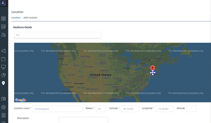 - Enter the Location Name. In this example, we will call it as VoltMXOffice. You can provide a Description for your geolocation if needed.