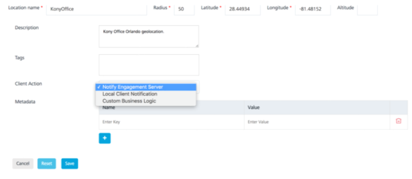 In the Client Action, there are three options available as shown. The Notify Engagement Server means the client application needs to update the device location with the Engagement server when the user enters the geoboundary. The Local Client Notification means that the application needs to display a local notification on the device. The Custom Business Logic mean that the any custom code set up with this geoboundary needs to be executed on the device.