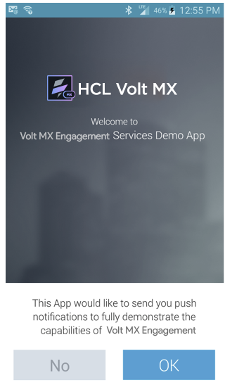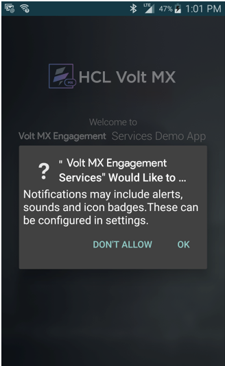 Click the application icon, on your device, after the installation is complete. This action will display the following screen and request your permission to send push notifications. Click Ok to accept push notifications.