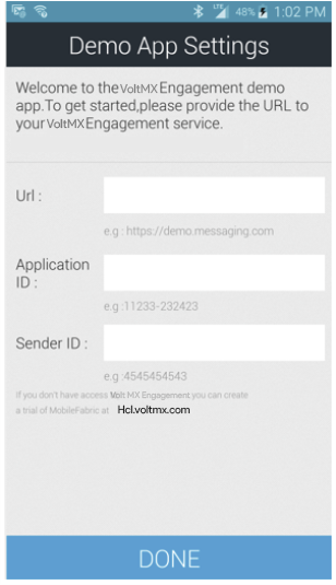 In the next screen, you will be prompted to enter your provisionedEngagement server URL, application ID and sender ID. Additional details of each of field is given below: