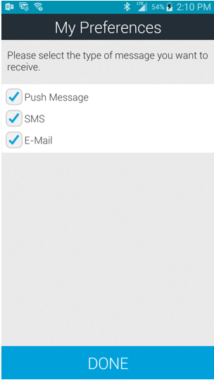 In the next screen, you will see that you are already subscribed to receive push notifications. Click SMS and E-Mail options and click Done. This will update your preferences to receive all the notifications types and navigates to the next screen.