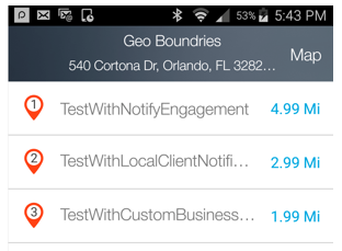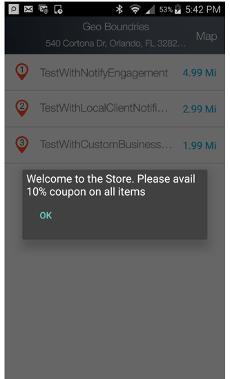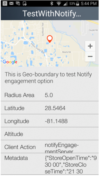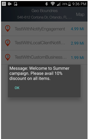 Once the device/application enters into the TestWithNotifyEngagement geoboundary, the campaign will send a notification to the device as shown below.