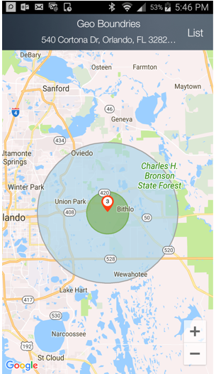 In the next screen, you will see a list of all the monitored geoboundaries. Assuming that you are in vicinity of the three geoboundaries that were set up in the previous chapter, you will be able to see the three geoboundaries. Click on the top right corner to view geoboundaries on the map.