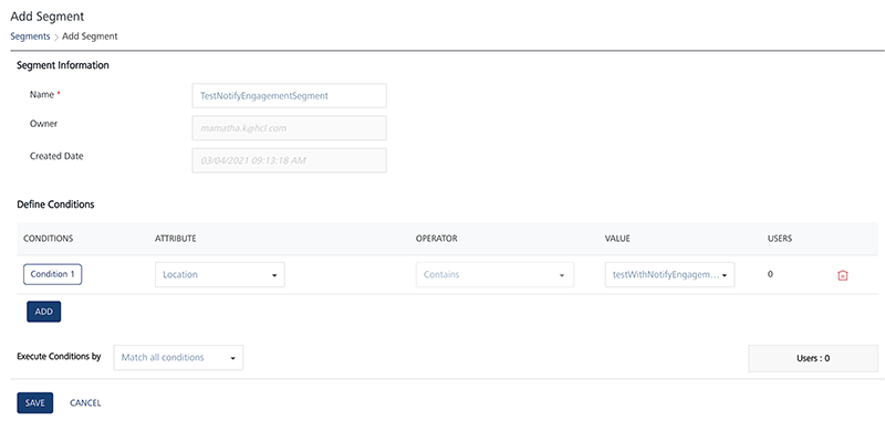 Click Add Segment to begin the Segment creation screen. Enter the name of the segment as TestNotifyEngagementSegment. In the Attribute column choose Location from the drop-down list. Choose the value as TestWithNotifyEngagement from the drop-down list. In the Execute Conditions By, choose Match All Conditions. This will show the count in the Users as 1.