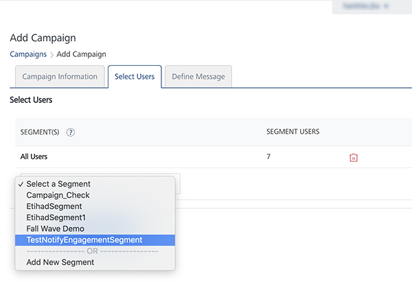 Select the segment TestNotifyEngagementSegment that was created. Click Next – Define Message to define the message for the campaign.