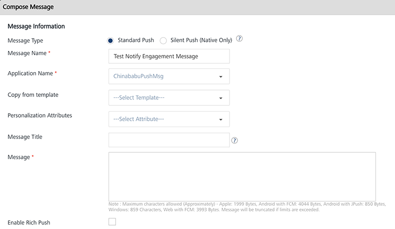Select the push message as the message channel. Enter the message name and choose the application name for which the notifications needs to be sent.