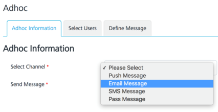 In the Adhoc section, select the Email Message channel. Click Next –Select Users to navigate to the next screen.