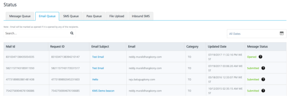 As mentioned in the previous section, you can also check the status of the sent Email message from the Status option under the Settings section of the Engagement Server. Click the Email Queue tab to see the status of the first email message as successfully submitted.