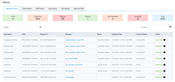 Click the Message Queue tab to view the status of the push messages sent. As you can see from the screen below, the first message in the list is what was submitted earlier. The status of this message indicates that it was successfully submitted.