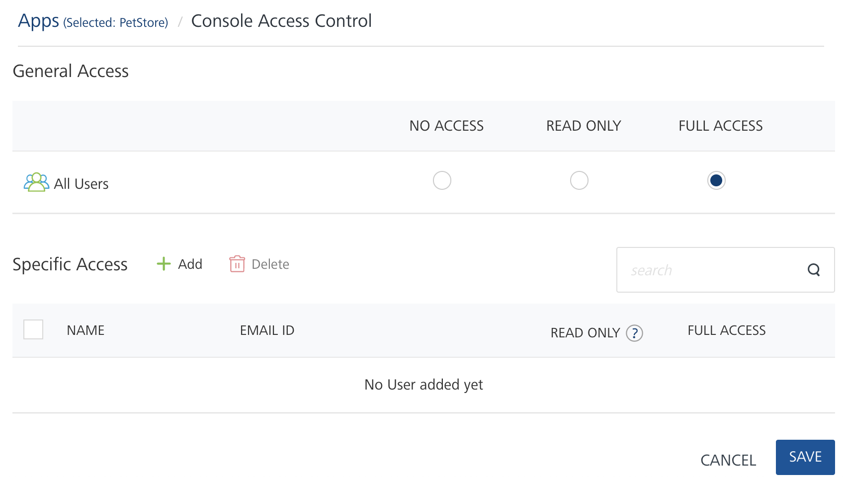 By default, all users have full access rights to create and access apps. If you want to block access to any of the other members on the account, select No Access. Users with no access permissions cannot access the app, and the app does not appear on the Applications page.