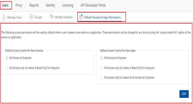 Important: When you edit the default access control permissions, the changes will apply to the apps and services created post change only and not the ones created before the edit.