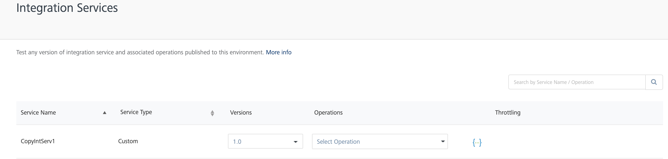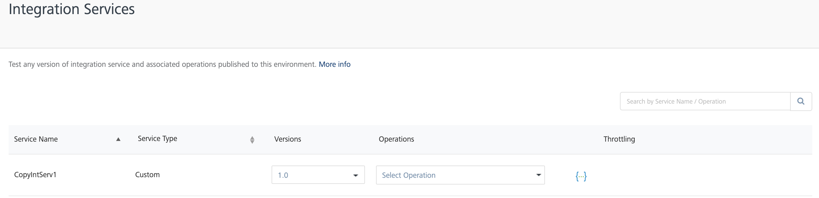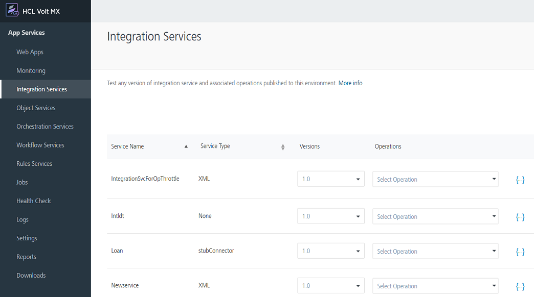 Click Integration Services from the left pane of the console to view a list of Integration services that are available across the applications within your Volt MX Foundry environment.