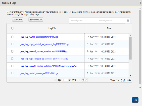 The log files for the server instance that are archived every hour and stored for seven days. You can view and download these archived log files. If the number of archived log files is more than 10, you can use Next or Previous to move to view other archived logs.