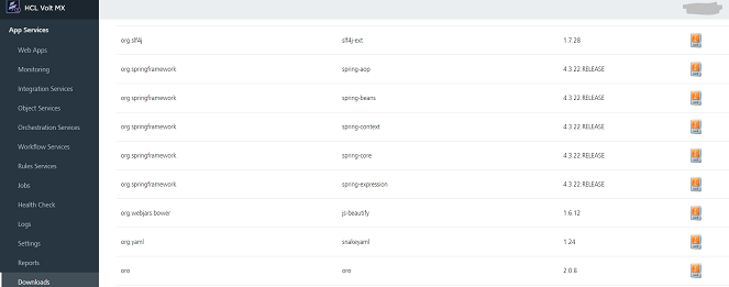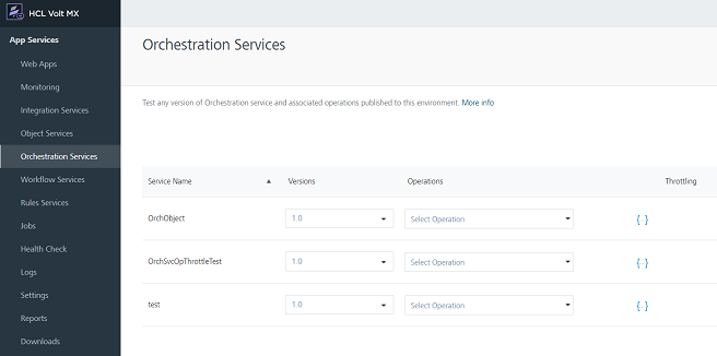 - Orchestration Services: Displays a list of Orchestration services that are added across your Volt MX Foundry apps.