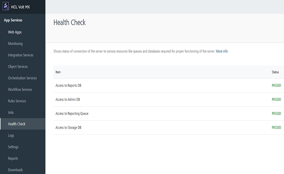 - Health Check: The Health check view denotes the connection properties for App Server in a cloud environment