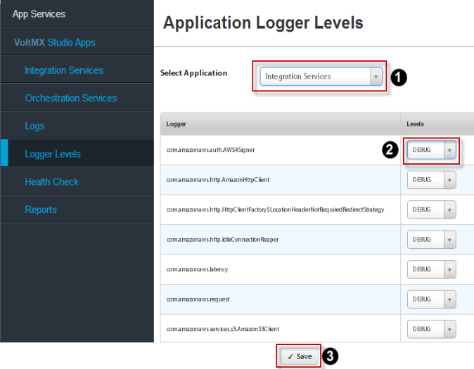 - On the Logger Levels page, select the type of service from the Select Application list.