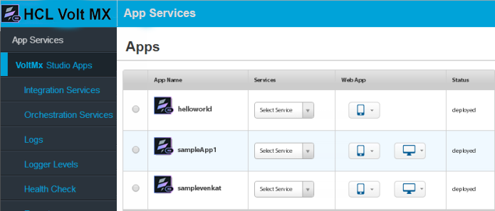- VoltMX Studio Apps: Displays a list of all the Volt MX Studio Apps.