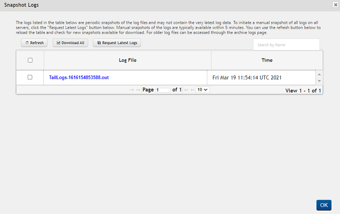 You can access real-time logs through the snapshot logs page. Snapshot logs comprise the last manual log snapshot fetched from the server.The logs listed in the table are periodic snapshots of the log files and may not contain the very latest log data. You can view and download these snapshot log files. If the number of snapshot log files is more than ten, you can use Next or Previous options to move to more number of snapshot log files.