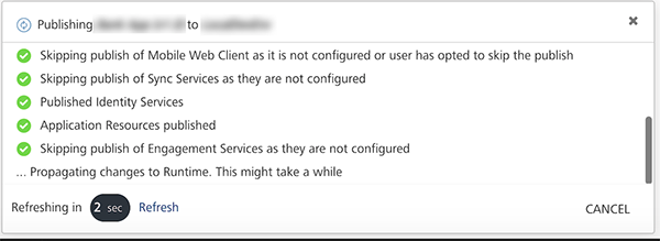 - To force a refresh of the app publish progress, click Refresh. The app publish also gets auto-refreshed at every three seconds for on-premises. For Volt MX Cloud, the app publish gets auto-refreshed at every five seconds.