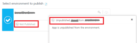 After the app is unpublished, the app status changes to Not Published in the Select environment to publishing section.