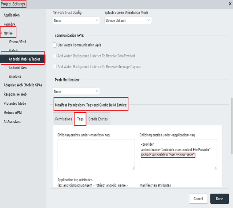 Under General Settings > Package Name, specify the desired package name.Under Manifest Permission, Tags and Gradle Build Entries, click the Tags tab.Under the Child tag entries under <application> tag text box, specify the same package name value for android:authorities="<package_name>".