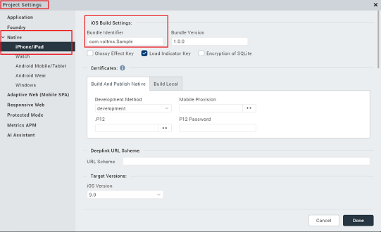 - If you choose to build an application for the iOS platform, you must provide the Mobile Provision, .P12, P12 password, and the Development method. To do so, go to Project Settings > Native > iPhone/iPad. For more details on the iOS configurations, click here.