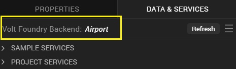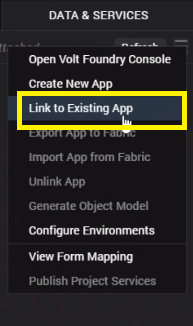 From the Data & Services panel, click Open Foundry Console > Use Existing or Link to Existing App. The list of pre-configured services appears.