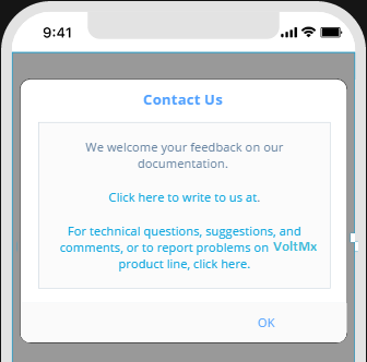 <p>We welcome your feedback on our documentation. <br><br><a href="https://techpubs@voltmx.com/">Click here to write to us at</a>.<br><br>\n<a href="https://support@voltmx.com/">For technical questions, suggestions, and comments, or to report problems on Volt MX product line, click here.</a>\n</p>