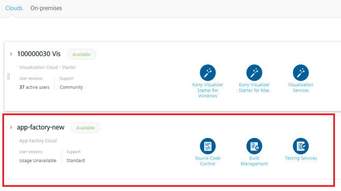 Once HCL AppFactory Cloud is enabled, you can view the HCL AppFactory Cloud along with other clouds in the Environments page in Volt MX Foundry Console.
