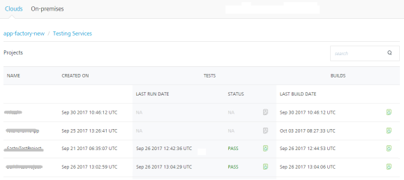 The Testing Services pages detail app names, test project creation date, test results and statuses, and build statuses of your apps.