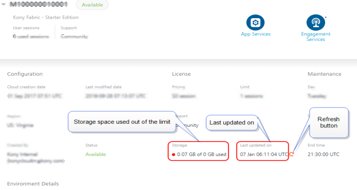 - Storage displays the amount of storage used and the allowed total storage limit for that environment.