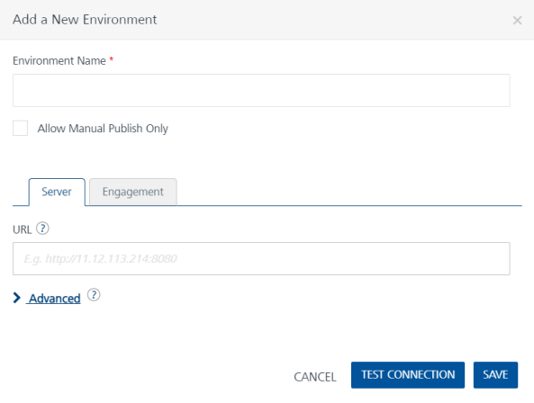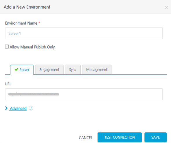 The Add a New Environment dialog contains the Server, Engagement, Sync, and Management tabs. The input values are URL, username, and password. By default, the system will display the Server tab.