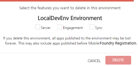 The system deletes the environment from the grid. If you delete this environment, all apps published to the environment may be lost forever. This may also include apps published before Volt MX Foundry registration.