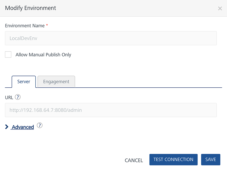 You can modify the environment, if required. Select the Allow Manual Publish Only check box for not publishing the .war file if you have uploaded it for Web platform under the Manage Client App Assets tab.