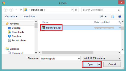 - Click Browse to select the app through the Microsoft Windows Open dialog box, click on the zip file of the app you want to import, and click Open.